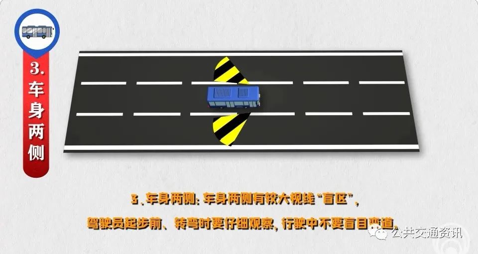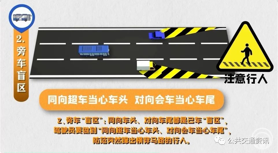 2、旁車“盲區(qū)”:同向車頭、對(duì)向車尾都是己車“盲區(qū)”,駕駛員要做到“同向超車當(dāng)心車頭、對(duì)向會(huì)車當(dāng)心車尾”,防范突然躥出橫穿馬路的行人。