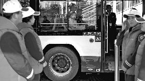 公交人下班后輪流在站臺當(dāng)起志愿者。晨報記者 王巍/攝