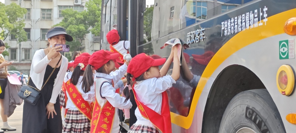 圖/同學(xué)們體驗(yàn)公交車清潔過程,自備小抹布為車身擦拭水漬,共護(hù)公交出行環(huán)境,倡導(dǎo)綠色出行。