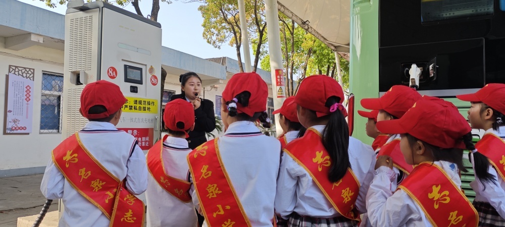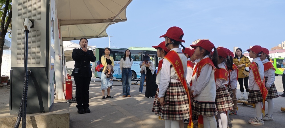 圖/在公交充電站,工作人員向同學(xué)們介紹充電樁的工作原理和純電動公交車的運(yùn)行優(yōu)點(diǎn)。