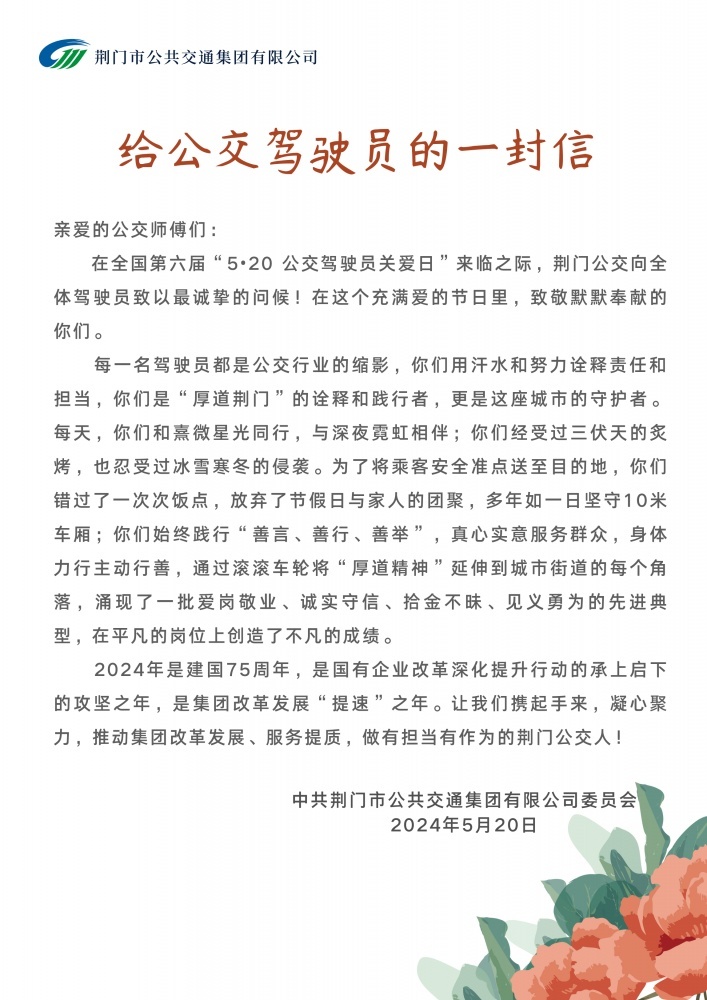 為倡導(dǎo)社會(huì)關(guān)愛公交駕駛員,營(yíng)造理解、尊重公交駕駛員的良好氛圍,5月20日,市公交集團(tuán)以“全國(guó)公交駕駛員關(guān)愛日”為契機(jī),通過一系列關(guān)愛駕駛員的活動(dòng),為公交駕駛員們送上節(jié)日祝福和關(guān)愛。