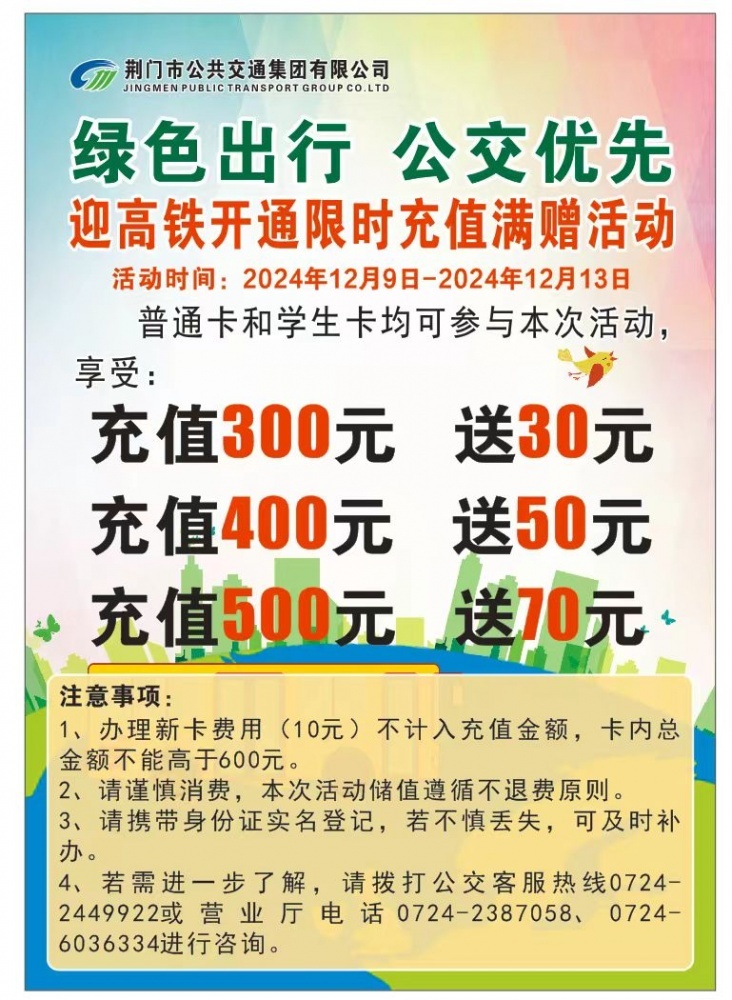 為迎接高鐵開(kāi)通,荊門公交限時(shí)儲(chǔ)值活動(dòng)開(kāi)啟,具體如下: