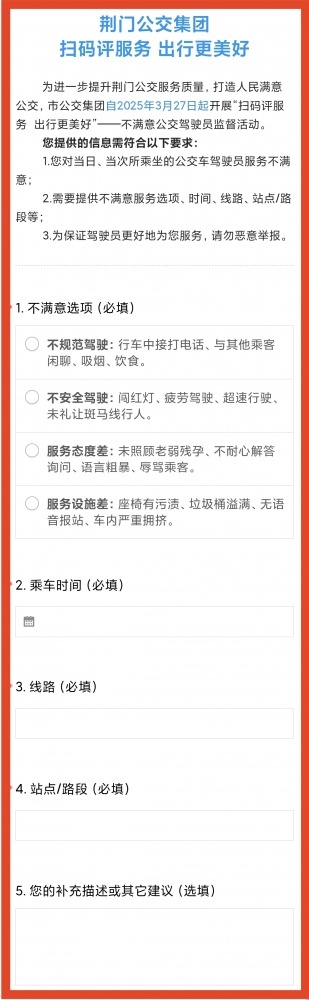 市民乘客可通過掃描公交車上的“服務(wù)監(jiān)督二維碼”,進入“不滿意公交駕駛員監(jiān)督舉報”頁面,填寫詳細舉報信息(評價頁面如下)。