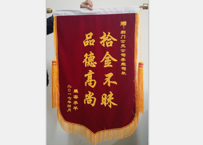 2017年4月4日上午九點左右,一名乘客由于粗心大意,不慎將一個包包遺留在公交車內(nèi),包包內(nèi)裝有蘋果平板電腦一個、手機一部、金銀手飾一包、銀行卡數(shù)張、身份證、現(xiàn)金若干.......二公司三路車159#駕駛員李榮在到達運動公園始發(fā)站打掃衛(wèi)生時發(fā)現(xiàn)了一個紅色包包,該駕駛員立馬與隊長取得聯(lián)系、剛好隊長和站務在始發(fā)站,駕駛員李榮親自將包交給了隊長,并說明原由,并在眾人下隊長打開了包包,發(fā)現(xiàn)里面的都是貴重物品。不久,失主打包內(nèi)的電話來詢問此事,隊長認真做了回復,告之為保證物品安全,要攜帶證明按程序認領(lǐng)。當天下午失主李女土從公司支部書記手中認領(lǐng)失物。昨日送來錦旗一面。