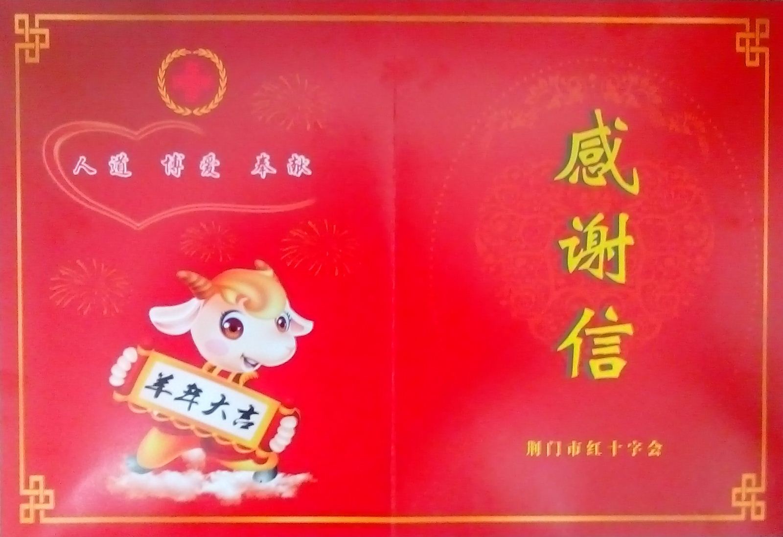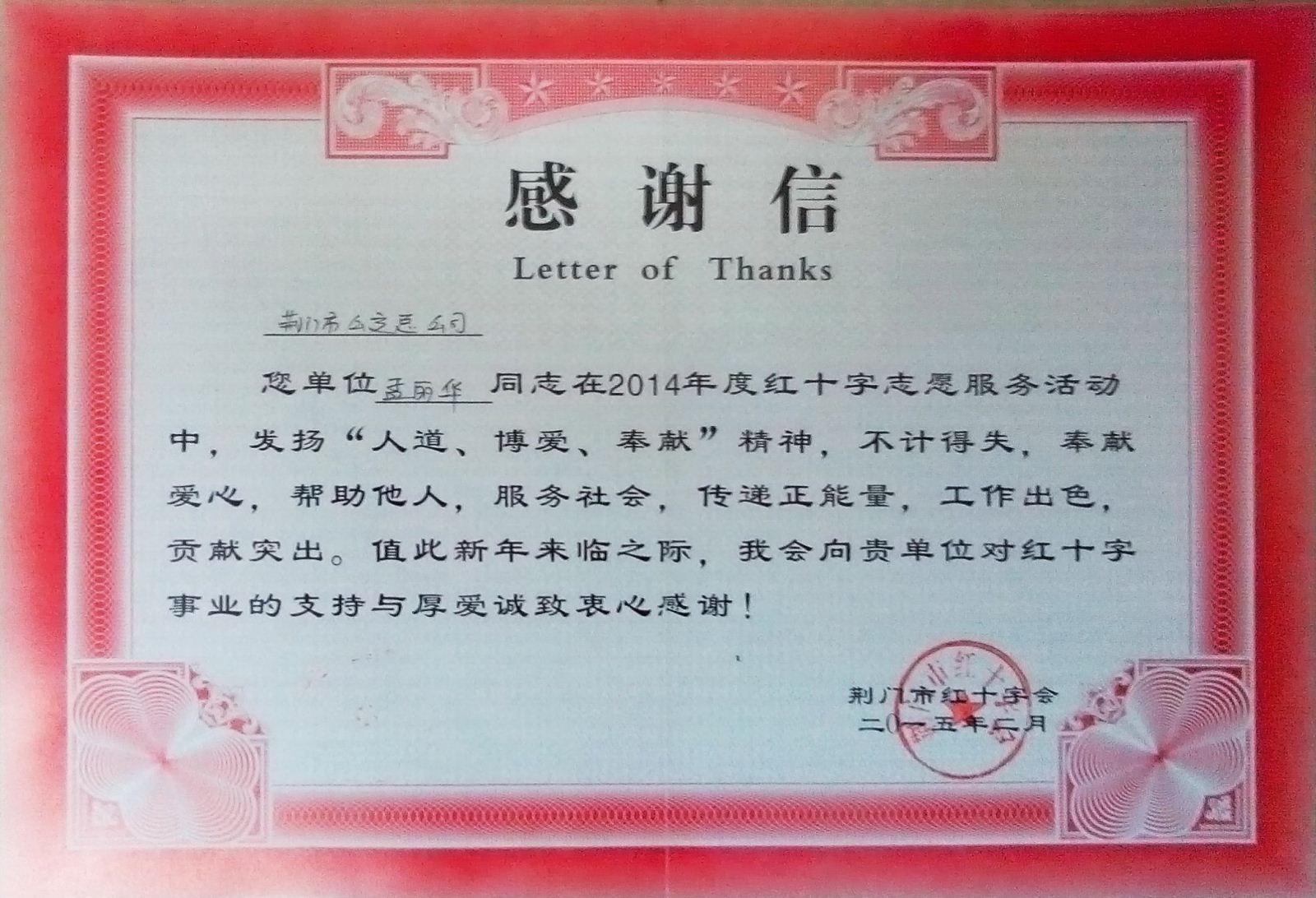孟麗華收到荊門市紅十字會感謝信