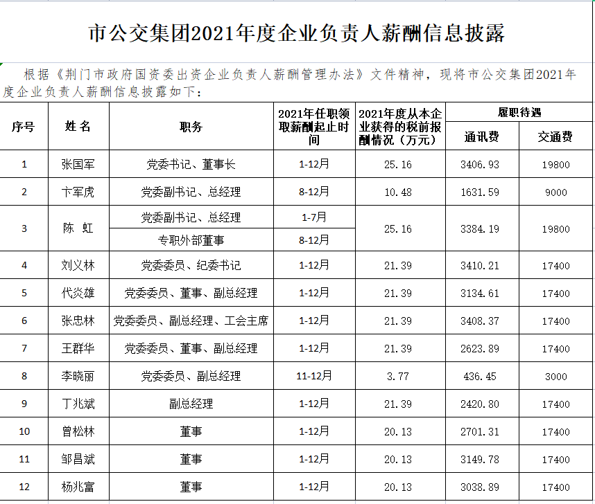 市公交集團(tuán)2021年度企業(yè)負(fù)責(zé)人薪酬信息披露